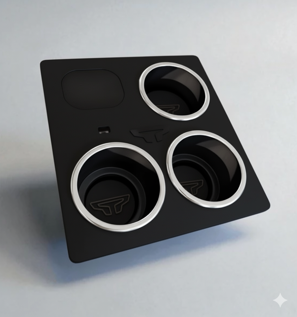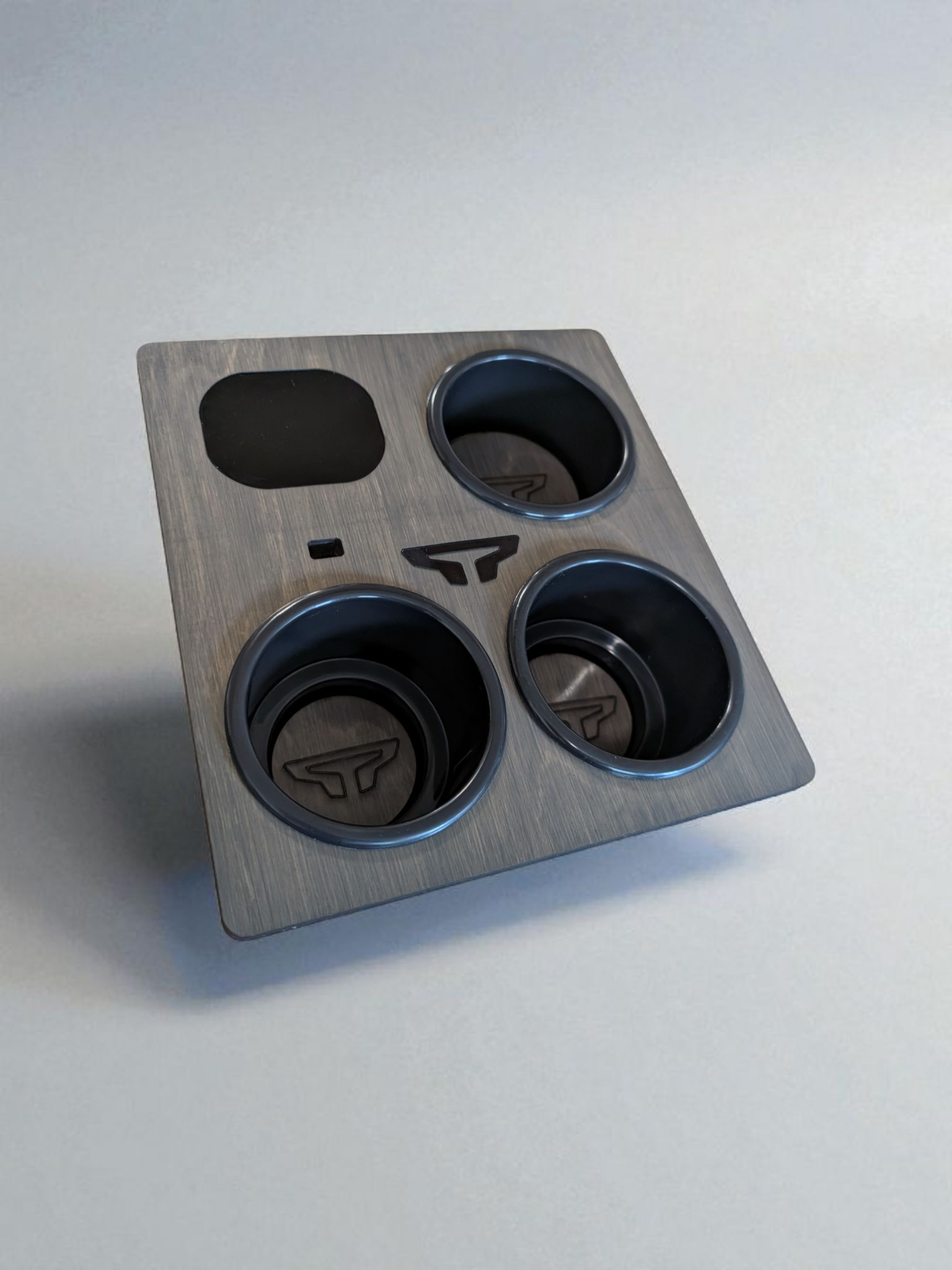 Precision Cut for your 2016-2024 Nissan Titan this console insert has 3 XL cupholders, USB cable pass through and your choice of a Magsafe charger or acrylic mounting plate.